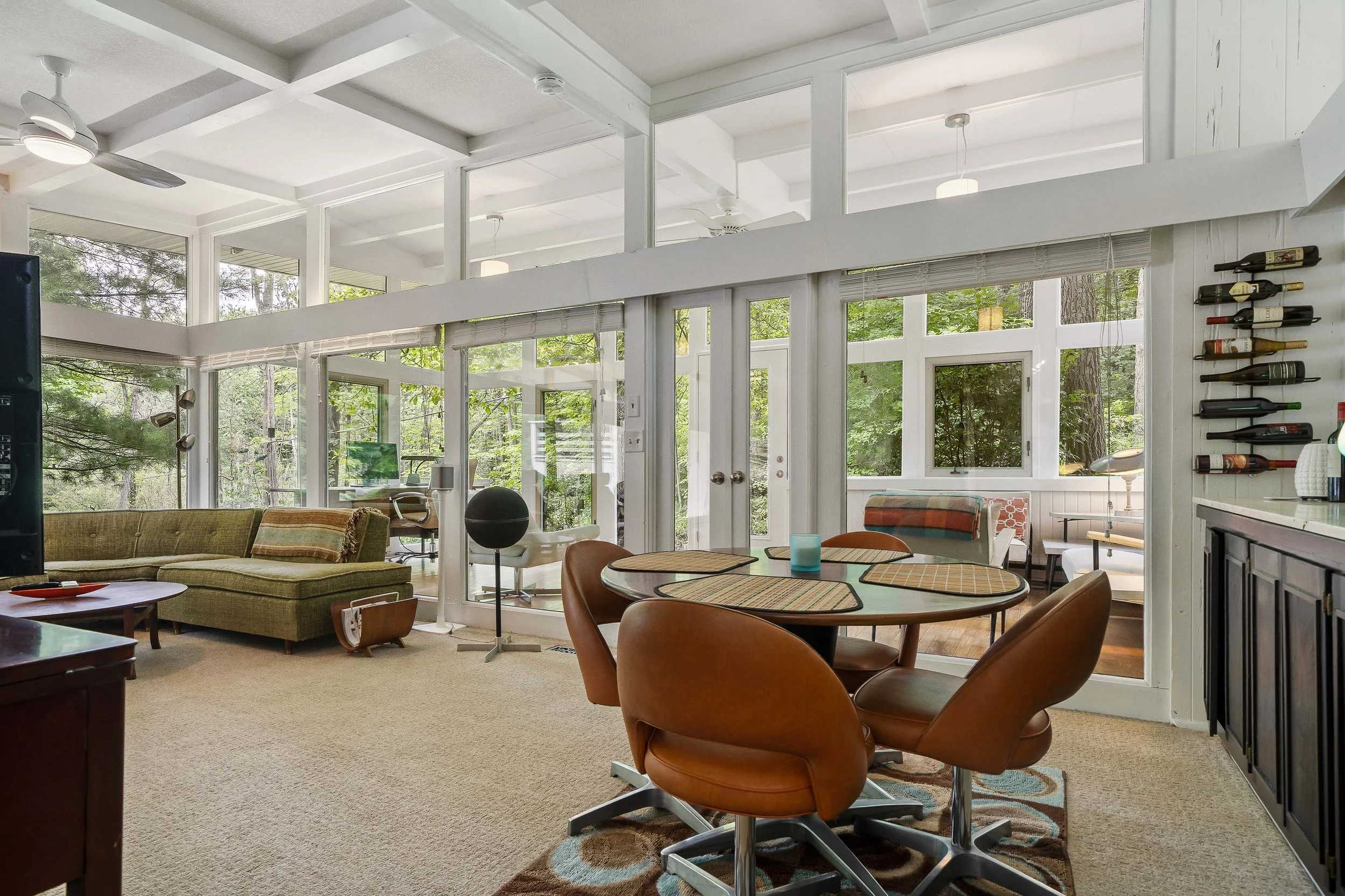Aerial view of a rural landscape with houses, green fields, and ponds, with a road running through the scene and a red barn near the ponds.